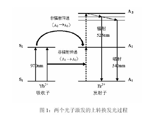 自然界中存在很多有機(jī)或無機(jī)物質(zhì),它們可以在電磁輻射激發(fā)下發(fā)射熒光或磷光,且在發(fā)光過程中遵守Stokes 規(guī)則,即發(fā)射光的波長長于激發(fā)光的波長。而在20 世紀(jì)70 年代,科學(xué)家們卻合成了一類可以反Stokes 規(guī)則產(chǎn)生磷光的特殊材料,即UCP。UCP 在紅外光區(qū)(波長>780nm)被激發(fā),卻可以發(fā)射波長遠(yuǎn)短于激發(fā)光的可見光(波長475nm-670nm),即能量上轉(zhuǎn)換。物質(zhì)構(gòu)成決定性質(zhì)特點(diǎn)。UCP 是由稀土金屬元素?fù)诫s于晶體的晶格中構(gòu)成的。在這種材料中有三種主要的成分:主基質(zhì)(Host Matrix)、吸收子(Absorber)和發(fā)射子(Emitter)。作為主基質(zhì)的晶體材料有:氧硫化物(如Y2O2S、GdO2S、La2O2S 等)、氟化物(如YF3、GdF3、LaF3 等)、鎵酸鹽(如YGaO3、Y3Ga5O12 等)以及硅酸鹽(如YSi2O5、YSi3O7 等)等;常用作吸收子的稀土金屬離子有:鐿離子(Yb3+)、鉺離子(Er3+)、釤離子(Sm3+)等;常用作發(fā)射子的稀土金屬離子有:鉺離子(Er3+)、鈥離子(Ho3+)、銩離子(Tm3+)、鋱離子(Tb3+)等。吸收子和發(fā)射子這一離子對在主基質(zhì)晶格內(nèi)適宜的空間取向和距離,是產(chǎn)生上轉(zhuǎn)換發(fā)光的基礎(chǔ)。上轉(zhuǎn)換發(fā)光的產(chǎn)生是一個涉及多個(至少兩個)光子的光學(xué)過程。在這個過程中(如圖1),UCP 內(nèi)的吸收子(如Yb3+)至少要吸收兩個低能量光子(紅外光區(qū),如970nm),而后經(jīng)過一系列內(nèi)部能量轉(zhuǎn)換,以非輻射的形式(A1→A2,A2→A3)將這兩個光子的能量連續(xù)傳遞給發(fā)射子(如Er3+),以使其處于激發(fā)態(tài)(A3)。后者接著發(fā)生一個返回基態(tài)能級的躍遷,釋放一個高能光子(可見光區(qū),如525nm 或540nm),完成能量上轉(zhuǎn)換。