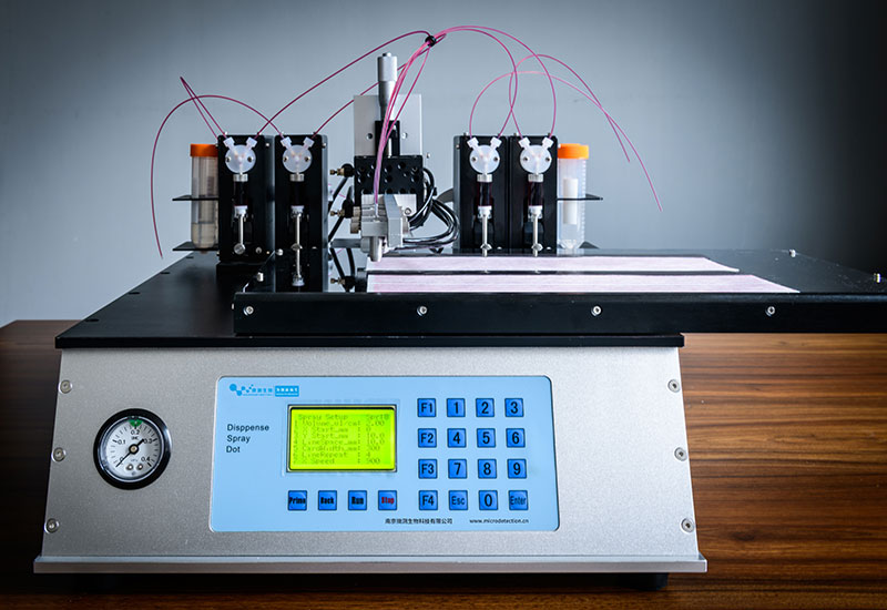 大平臺多通道噴金標機應用于生產過程中均勻地把膠體金,熒光微球,量子點等顆粒均勻地噴在聚酯膜,玻纖等材料上。相比于傳統(tǒng)的噴金機,效率大大提高,是特大型企業(yè)必備的生產設備之一。