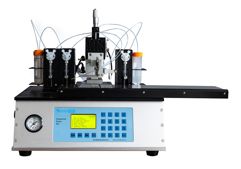 劃膜噴膜儀應(yīng)用于側(cè)向?qū)游鲈嚰垪l領(lǐng)域,主要?jiǎng)澗€,噴金,噴點(diǎn)三大功能,可將檢測(cè)線和質(zhì)控線試劑噴涂到層析膜介質(zhì)上(例如硝酸纖維素膜),同時(shí)也可以將標(biāo)記物均勻,定量噴點(diǎn)到聚酯膜或玻璃纖維膜上的儀器,還可以在NC膜上噴點(diǎn)狀的抗原或抗體(多應(yīng)用于干化學(xué)或滲漏法)。使用進(jìn)口PEEK劃膜軟管將蛋白溶液印跡到層析膜表面,因使用的是軟管,柔韌性好,可有效降低劃痕對(duì)側(cè)向流動(dòng)的標(biāo)記復(fù)合物形成的阻力,避免假陽(yáng)性的發(fā)生。其工作原理是依靠步進(jìn)微量泵驅(qū)動(dòng),該儀器使用24000步的進(jìn)口步進(jìn)泵,出液精度控制在0.01ul,此劃線步驟無(wú)法用人工取代。